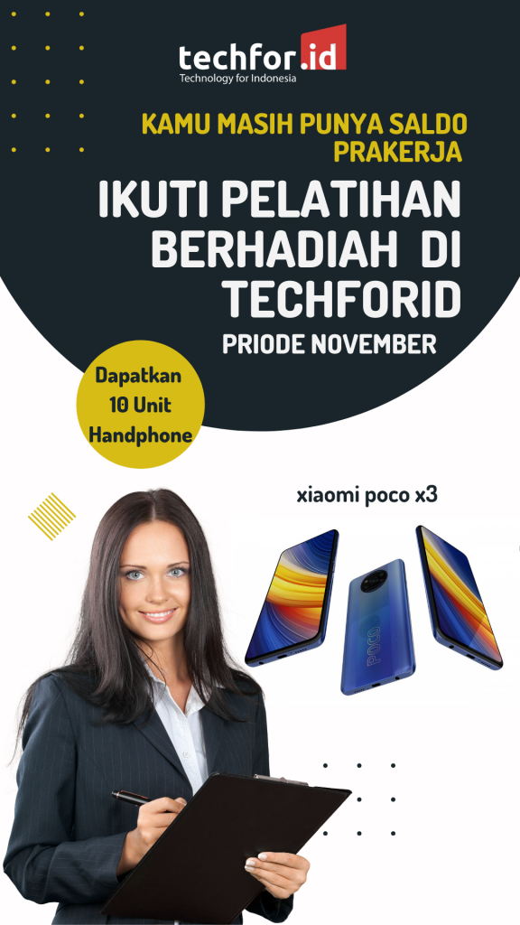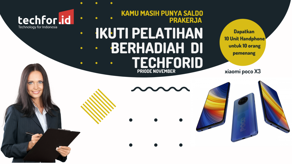 Halo semua TechforID segera membuka pelatihan berhadiah lagi nih, Program Hadiah Spesial di tahun 2021 untuk Kamu para pemegang program Kartu prakerja yang membeli Materi pelatihan di TechforID. Dalam rangka mendukung program kartu prakerja. Kamu bisa memenangkan 10 Buah Handphone Xiomi poco X3 yang di undi untuk 10 pemenang! Yuk, simak cara gampangya di sini :